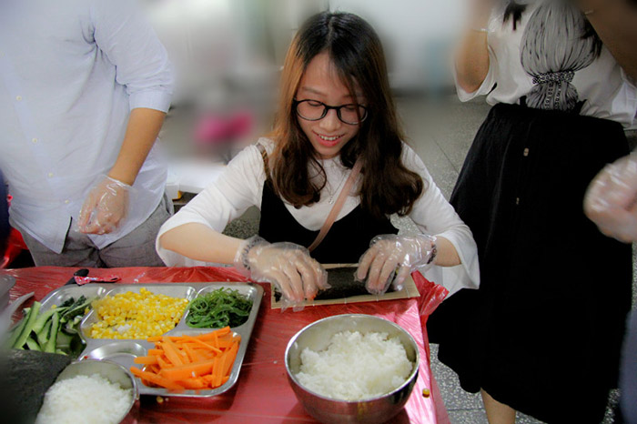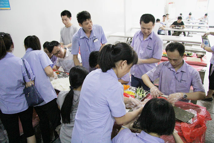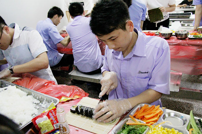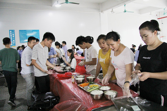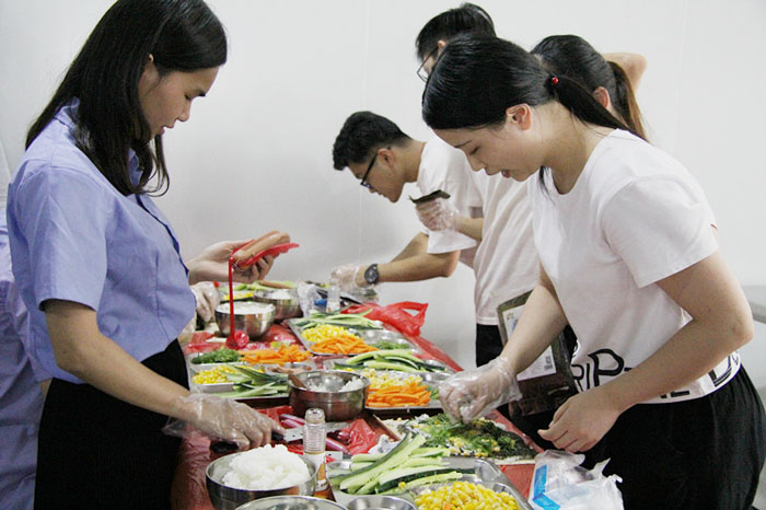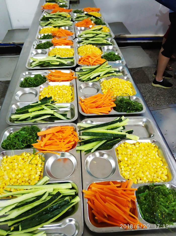 當(dāng)天17:00,小吃貨們翹首期盼的時(shí)刻終于來了。大家分工合作,帶上手套切食材,將材料按組分配。