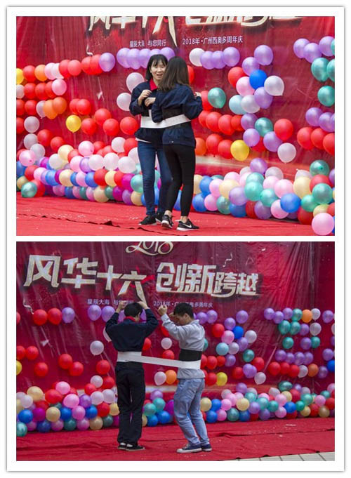 通過轉(zhuǎn)圈方式把腰上的布條纏到隊(duì)友上,纏的過程中不可以用手觸屏。大家為了比賽,為了榮譽(yù),也為了歡笑,各出奇招,現(xiàn)場(chǎng)一片歡鬧。